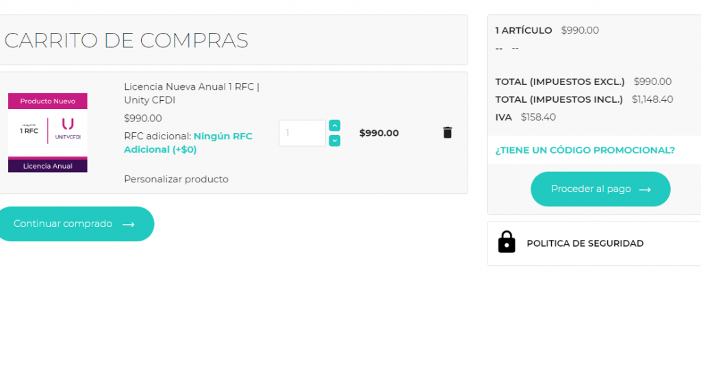 Una vez hayas iniciado sesión con tu cuenta, debes buscar el producto de tu preferencia o interés, (Unity CFDI) ya sea en el carrusel de imágenes, en la página principal o en la barra buscadora.