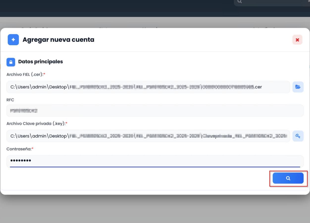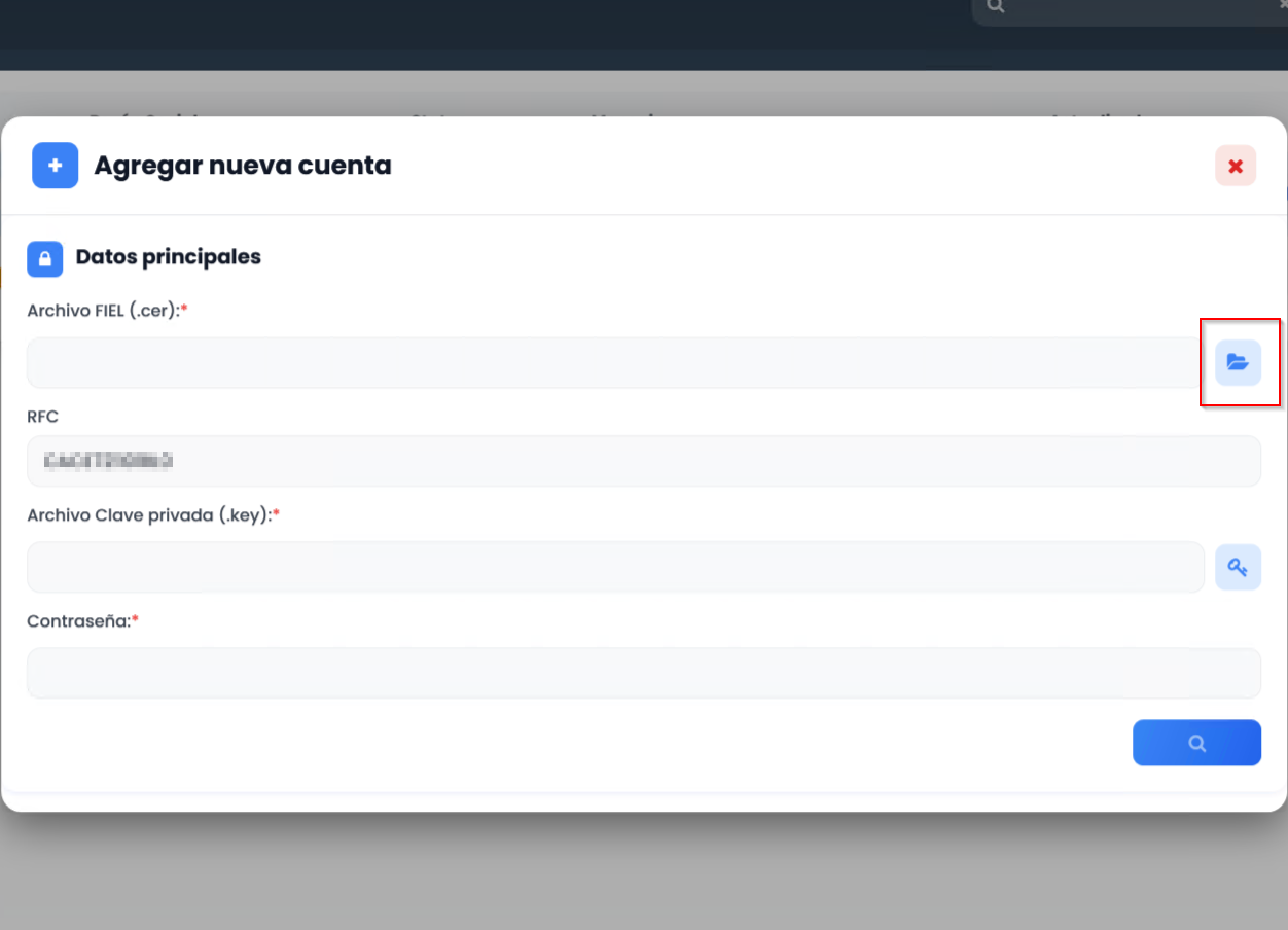 Da clic en el botón azul con la lupa (?) para que el sistema cargue la FIEL.